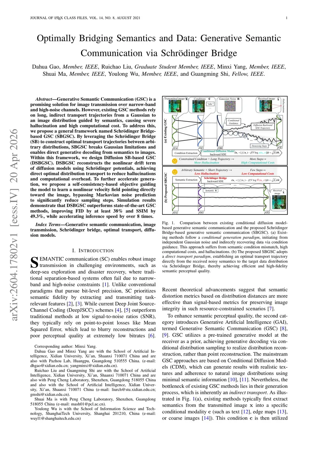 Generative Semantic Communication (GSC) is a promising solution for image transmission over narrow-band and high-noise channels. However, existing GSC methods rely on long, indirect transport trajectories from a Gaussian to an image distribution guided by semantics, causing severe hallucination and high computational cost. To address this, we propose a general framework named Schrödinger Bridge-based GSC (SBGSC). By leveraging the Schrödinger Bridge (SB) to construct optimal transport trajectories between arbitrary distributions, SBGSC breaks Gaussian limitations and enables direct generative decoding from semantics to images. Within this framework, we design Diffusion SB-based GSC (DSBGSC). DSBGSC reconstructs the nonlinear drift term of diffusion models using Schrödinger potentials, achieving direct optimal distribution transport to reduce hallucinations and computational overhead. To further accelerate generation, we propose a self-consistency-based objective guiding the model to learn a nonlinear velocity field pointing directly toward the image, bypassing Markovian noise prediction to significantly reduce sampling steps. Simulation results demonstrate that DSBGSC outperforms state-of-the-art GSC methods, improving FID by at least 38% and SSIM by 49.3%, while accelerating inference speed by over 8 times.