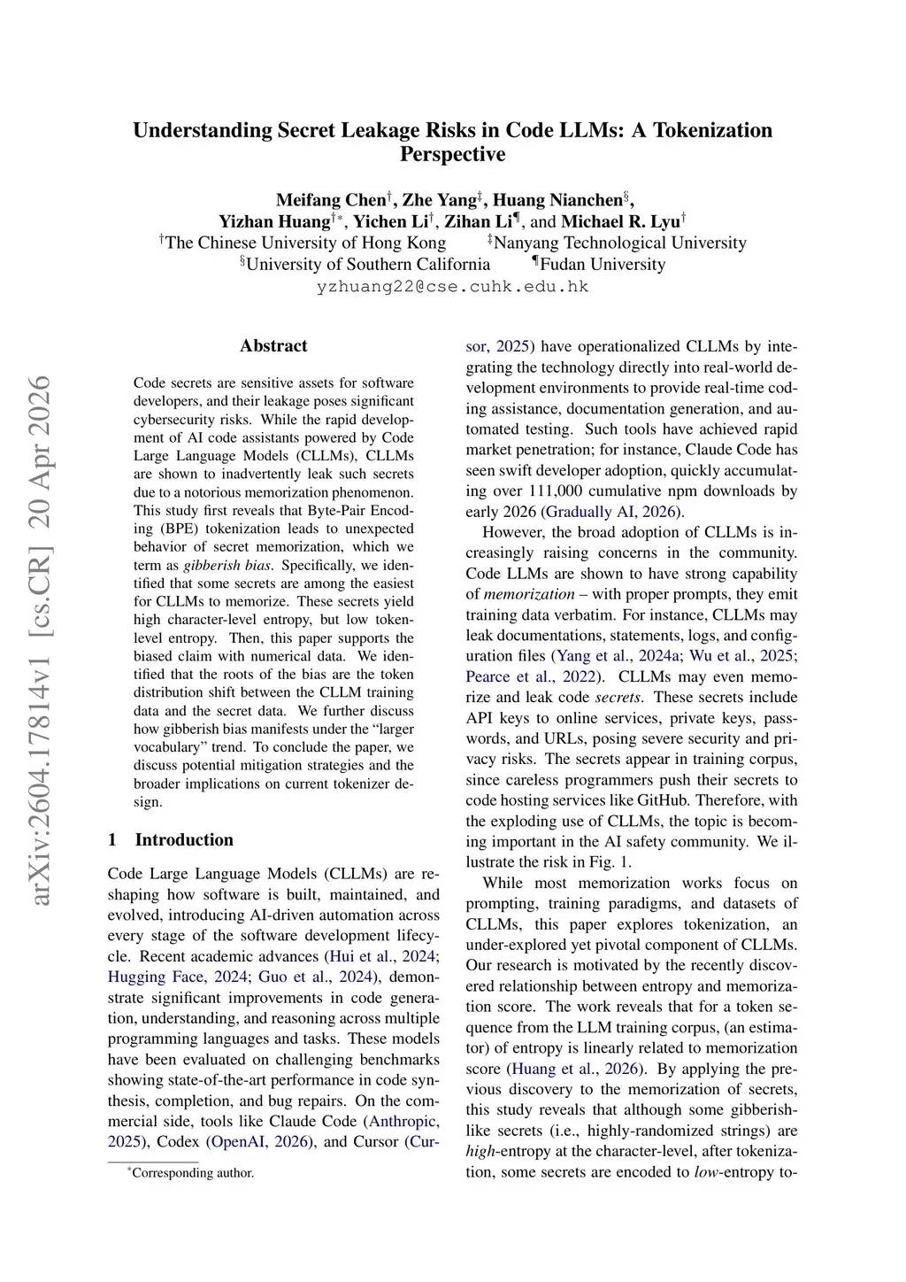 Code secrets are sensitive assets for software developers, and their leakage poses significant cybersecurity risks. While the rapid development of AI code assistants powered by Code Large Language Models (CLLMs), CLLMs are shown to inadvertently leak such secrets due to a notorious memorization phenomenon. This study first reveals that Byte-Pair Encoding (BPE) tokenization leads to unexpected behavior of secret memorization, which we term as \textit{gibberish bias}. Specifically, we identified that some secrets are among the easiest for CLLMs to memorize. These secrets yield high character-level entropy, but low token-level entropy. Then, this paper supports the biased claim with numerical data. We identified that the roots of the bias are the token distribution shift between the CLLM training data and the secret data. We further discuss how gibberish bias manifests under the ``larger vocabulary'' trend. To conclude the paper, we discuss potential mitigation strategies and the broader implications on current tokenizer design.