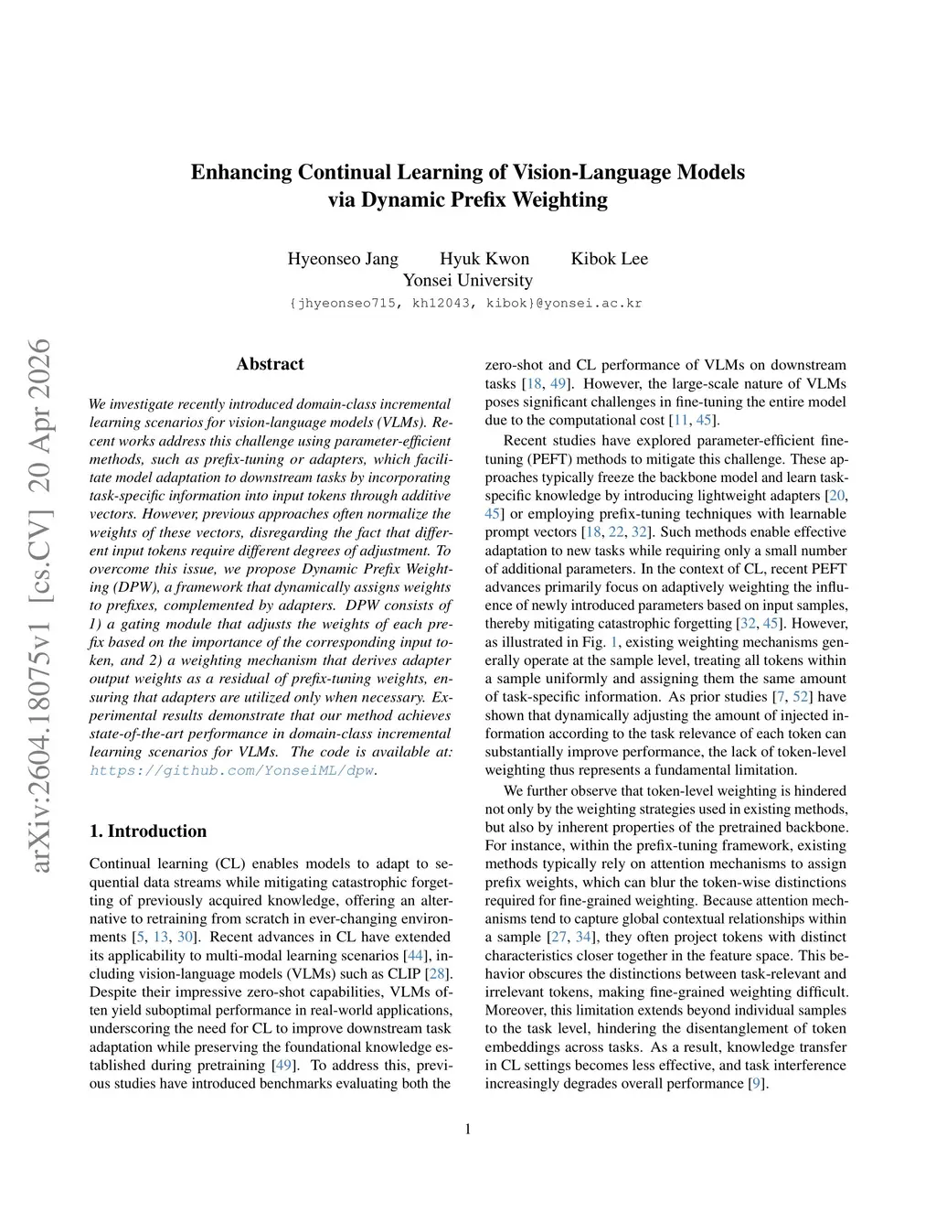 Enhancing Continual Learning of Vision-Language Models via Dynamic Prefix Weighting