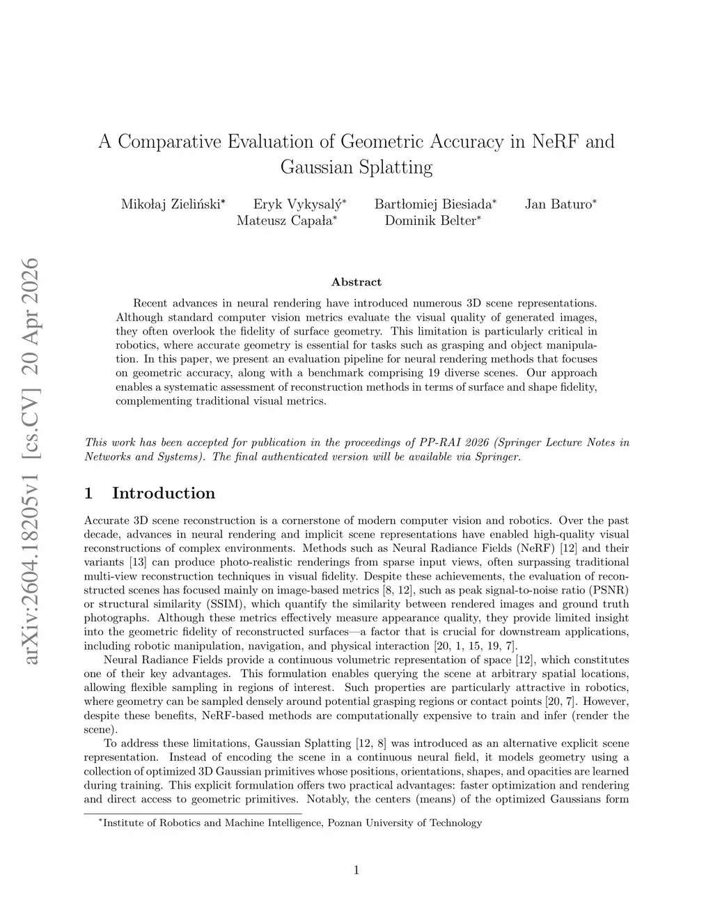 Recent advances in neural rendering have introduced numerous 3D scene representations. Although standard computer vision metrics evaluate the visual quality of generated images, they often overlook the fidelity of surface geometry. This limitation is particularly critical in robotics, where accurate geometry is essential for tasks such as grasping and object manipulation. In this paper, we present an evaluation pipeline for neural rendering methods that focuses on geometric accuracy, along with a benchmark comprising 19 diverse scenes. Our approach enables a systematic assessment of reconstruction methods in terms of surface and shape fidelity, complementing traditional visual metrics.