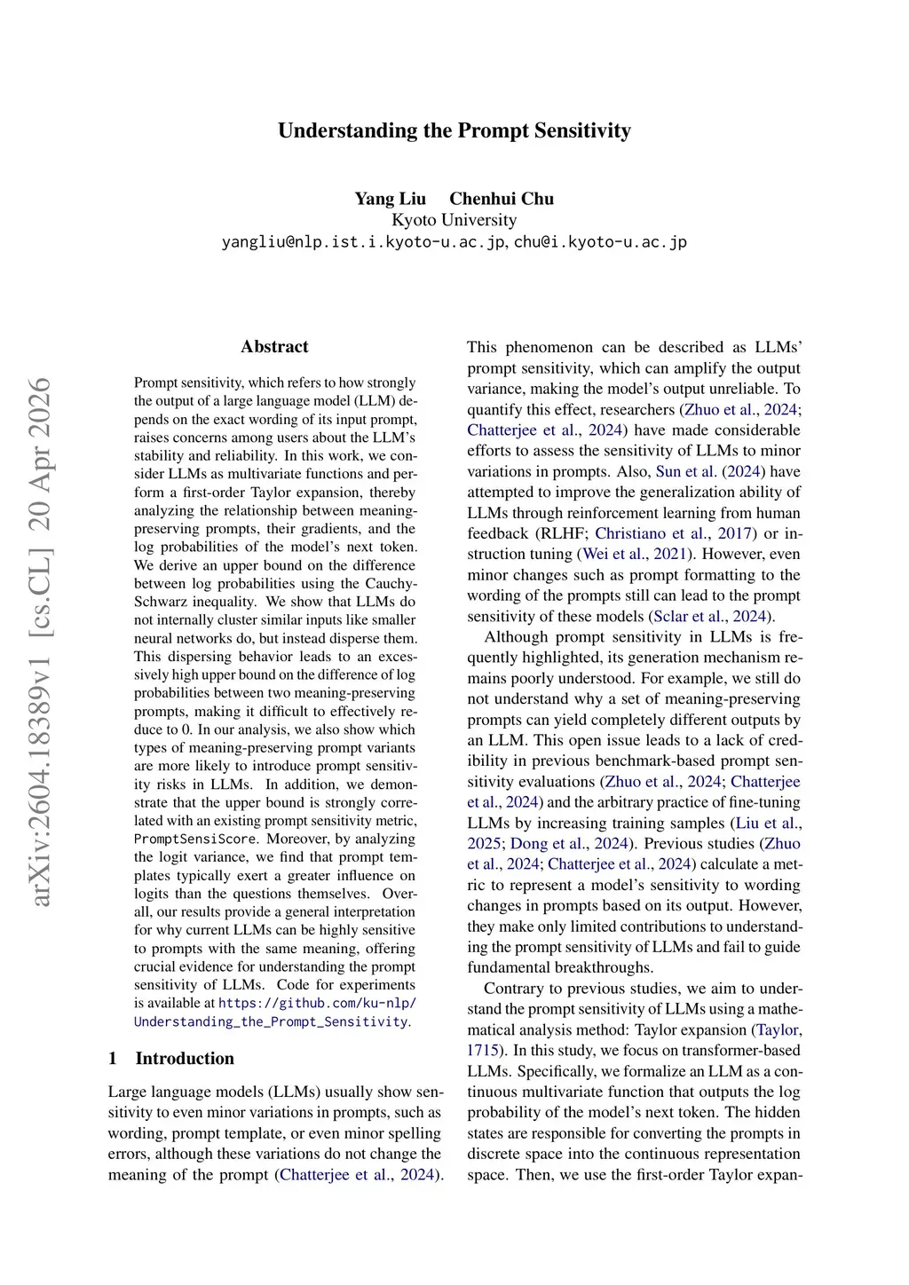 Prompt sensitivity, which refers to how strongly the output of a large language model (LLM) depends on the exact wording of its input prompt, raises concerns among users about the LLM's stability and reliability. In this work, we consider LLMs as multivariate functions and perform a first-order Taylor expansion, thereby analyzing the relationship between meaning-preserving prompts, their gradients, and the log probabilities of the model's next token. We derive an upper bound on the difference between log probabilities using the Cauchy-Schwarz inequality. We show that LLMs do not internally cluster similar inputs like smaller neural networks do, but instead disperse them. This dispersing behavior leads to an excessively high upper bound on the difference of log probabilities between two meaning-preserving prompts, making it difficult to effectively reduce to 0. In our analysis, we also show which types of meaning-preserving prompt variants are more likely to introduce prompt sensitivity risks in LLMs. In addition, we demonstrate that the upper bound is strongly correlated with an existing prompt sensitivity metric, PromptSensiScore. Moreover, by analyzing the logit variance, we find that prompt templates typically exert a greater influence on logits than the questions themselves. Overall, our results provide a general interpretation for why current LLMs can be highly sensitive to prompts with the same meaning, offering crucial evidence for understanding the prompt sensitivity of LLMs. Code for experiments is available atthis https URL.