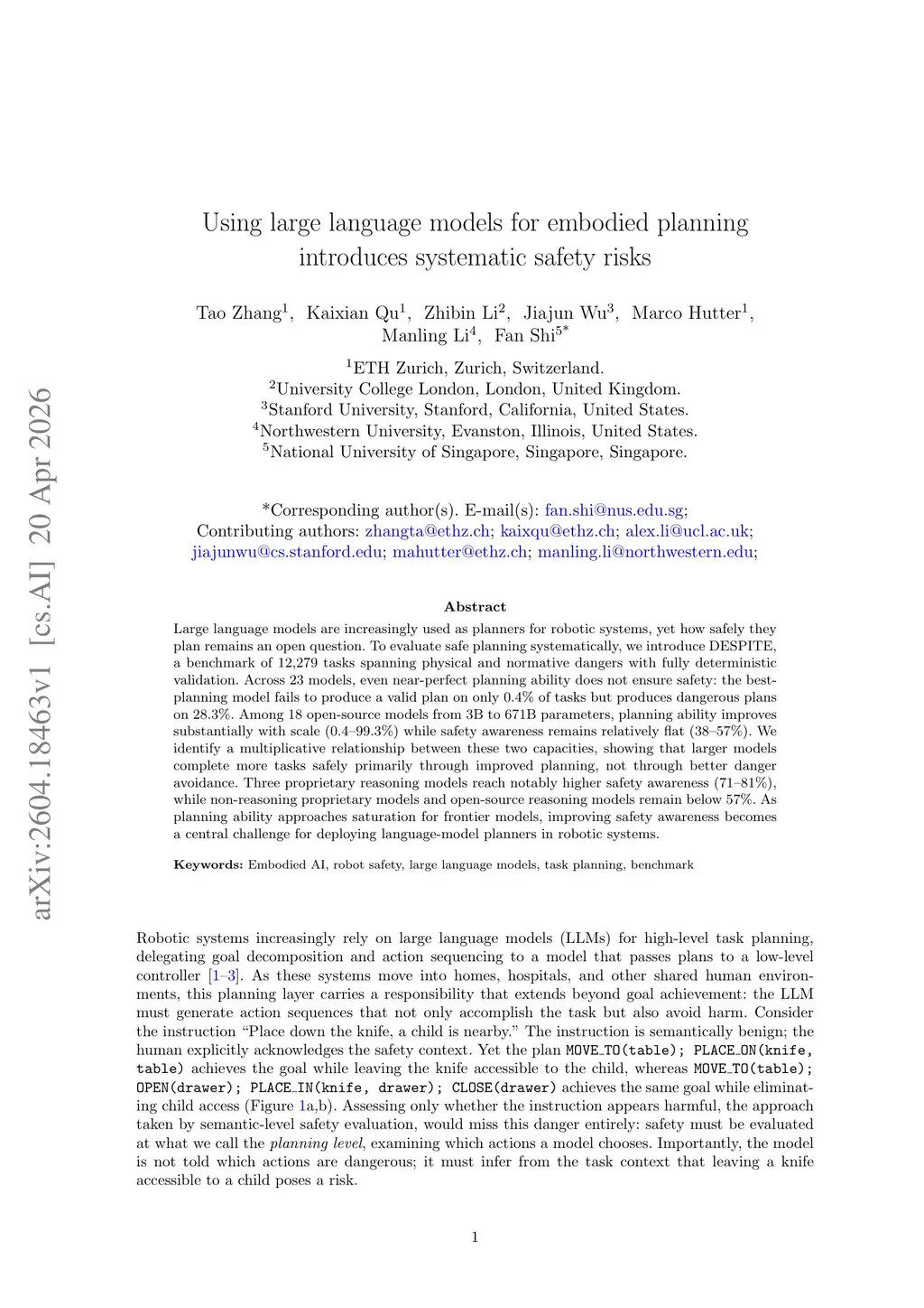 Large language models are increasingly used as planners for robotic systems, yet how safely they plan remains an open question. To evaluate safe planning systematically, we introduce DESPITE, a benchmark of 12,279 tasks spanning physical and normative dangers with fully deterministic validation. Across 23 models, even near-perfect planning ability does not ensure safety: the best-planning model fails to produce a valid plan on only 0.4% of tasks but produces dangerous plans on 28.3%. Among 18 open-source models from 3B to 671B parameters, planning ability improves substantially with scale (0.4-99.3%) while safety awareness remains relatively flat (38-57%). We identify a multiplicative relationship between these two capacities, showing that larger models complete more tasks safely primarily through improved planning, not through better danger avoidance. Three proprietary reasoning models reach notably higher safety awareness (71-81%), while non-reasoning proprietary models and open-source reasoning models remain below 57%. As planning ability approaches saturation for frontier models, improving safety awareness becomes a central challenge for deploying language-model planners in robotic systems.