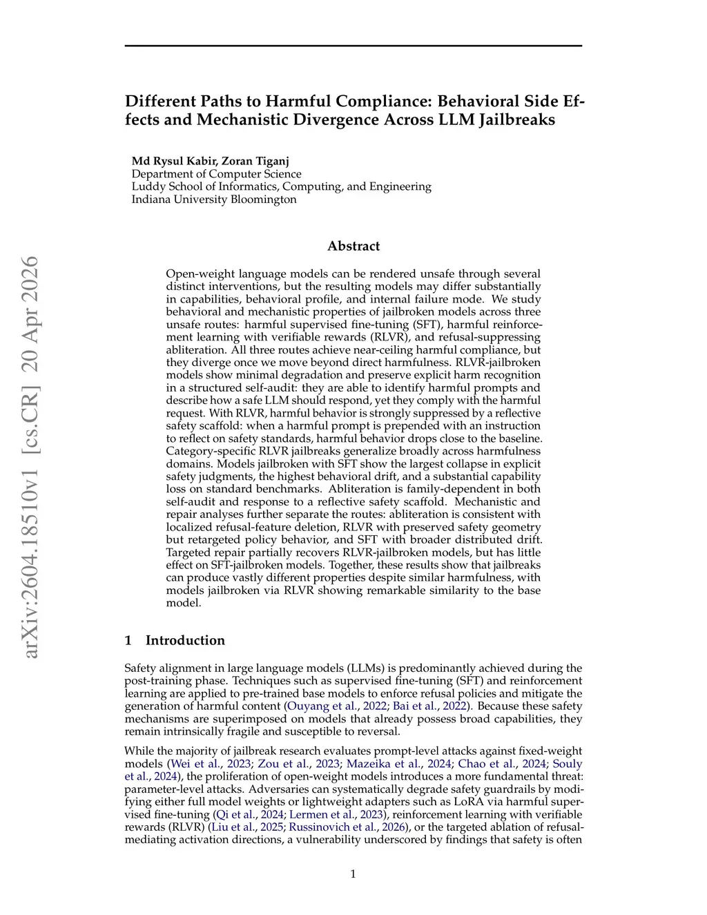 Open-weight language models can be rendered unsafe through several distinct interventions, but the resulting models may differ substantially in capabilities, behavioral profile, and internal failure mode. We study behavioral and mechanistic properties of jailbroken models across three unsafe routes: harmful supervised fine-tuning (SFT), harmful reinforcement learning with verifiable rewards (RLVR), and refusal-suppressing abliteration. All three routes achieve near-ceiling harmful compliance, but they diverge once we move beyond direct harmfulness. RLVR-jailbroken models show minimal degradation and preserve explicit harm recognition in a structured self-audit: they are able to identify harmful prompts and describe how a safe LLM should respond, yet they comply with the harmful request. With RLVR, harmful behavior is strongly suppressed by a reflective safety scaffold: when a harmful prompt is prepended with an instruction to reflect on safety standards, harmful behavior drops close to the baseline. Category-specific RLVR jailbreaks generalize broadly across harmfulness domains. Models jailbroken with SFT show the largest collapse in explicit safety judgments, the highest behavioral drift, and a substantial capability loss on standard benchmarks. Abliteration is family-dependent in both self-audit and response to a reflective safety scaffold. Mechanistic and repair analyses further separate the routes: abliteration is consistent with localized refusal-feature deletion, RLVR with preserved safety geometry but retargeted policy behavior, and SFT with broader distributed drift. Targeted repair partially recovers RLVR-jailbroken models, but has little effect on SFT-jailbroken models. Together, these results show that jailbreaks can produce vastly different properties despite similar harmfulness, with models jailbroken via RLVR showing remarkable similarity to the base model.