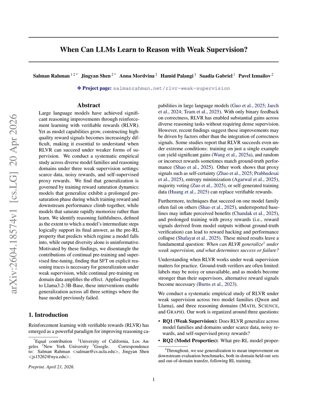 Large language models have achieved significant reasoning improvements through reinforcement learning with verifiable rewards (RLVR). Yet as model capabilities grow, constructing high-quality reward signals becomes increasingly difficult, making it essential to understand when RLVR can succeed under weaker forms of supervision. We conduct a systematic empirical study across diverse model families and reasoning domains under three weak supervision settings: scarce data, noisy rewards, and self-supervised proxy rewards. We find that generalization is governed by training reward saturation dynamics: models that generalize exhibit a prolonged pre-saturation phase during which training reward and downstream performance climb together, while models that saturate rapidly memorize rather than learn. We identify reasoning faithfulness, defined as the extent to which intermediate steps logically support the final answer, as the pre-RL property that predicts which regime a model falls into, while output diversity alone is uninformative. Motivated by these findings, we disentangle the contributions of continual pre-training and supervised fine-tuning, finding that SFT on explicit reasoning traces is necessary for generalization under weak supervision, while continual pre-training on domain data amplifies the effect. Applied together to Llama3.2-3B-Base, these interventions enable generalization across all three settings where the base model previously failed.