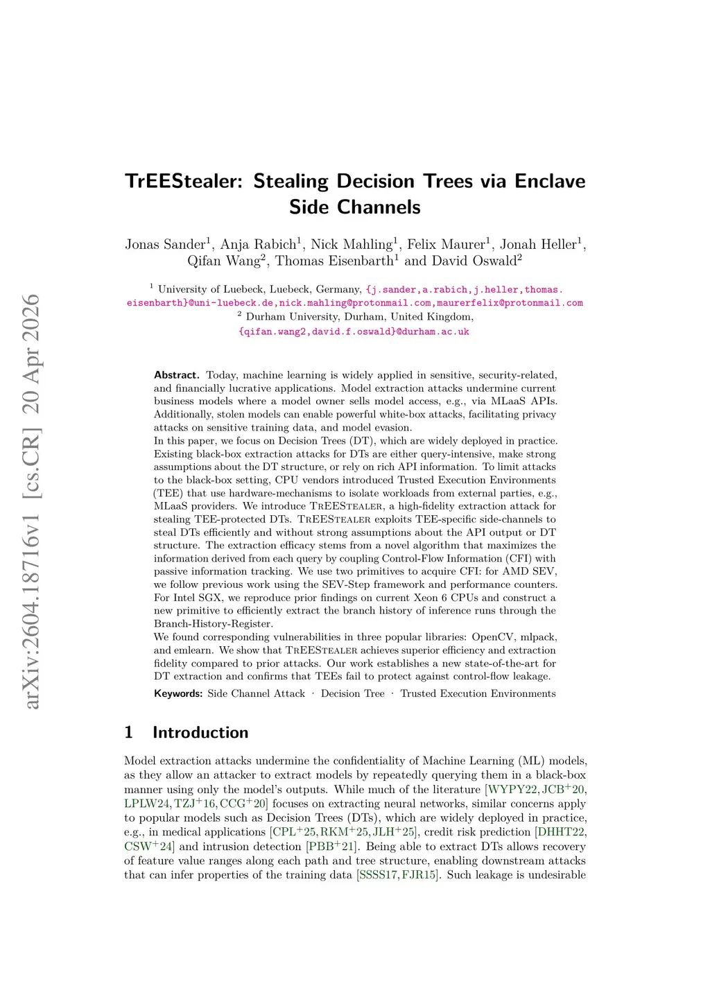 Today, machine learning is widely applied in sensitive, security-related, and financially lucrative applications. Model extraction attacks undermine current business models where a model owner sells model access, e.g., via MLaaS APIs. Additionally, stolen models can enable powerful white-box attacks, facilitating privacy attacks on sensitive training data, and model evasion.In this paper, we focus on Decision Trees (DT), which are widely deployed in practice. Existing black-box extraction attacks for DTs are either query-intensive, make strong assumptions about the DT structure, or rely on rich API information. To limit attacks to the black-box setting, CPU vendors introduced Trusted Execution Environments (TEE) that use hardware-mechanisms to isolate workloads from external parties, e.g., MLaaS providers. We introduce TrEEStealer, a high-fidelity extraction attack for stealing TEE-protected DTs. TrEEStealer exploits TEE-specific side-channels to steal DTs efficiently and without strong assumptions about the API output or DT structure. The extraction efficacy stems from a novel algorithm that maximizes the information derived from each query by coupling Control-Flow Information (CFI) with passive information tracking. We use two primitives to acquire CFI: for AMD SEV, we follow previous work using the SEV-Step framework and performance counters. For Intel SGX, we reproduce prior findings on current Xeon 6 CPUs and construct a new primitive to efficiently extract the branch history of inference runs through the Branch-History-Register.We found corresponding vulnerabilities in three popular libraries: OpenCV, mlpack, and emlearn. We show that TrEEStealer achieves superior efficiency and extraction fidelity compared to prior attacks. Our work establishes a new state-of-the-art for DT extraction and confirms that TEEs fail to protect against control-flow leakage.