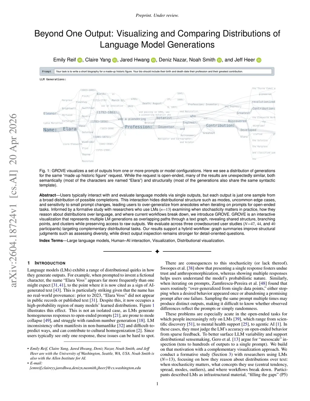 Users typically interact with and evaluate language models via single outputs, but each output is just one sample from a broad distribution of possible completions. This interaction hides distributional structure such as modes, uncommon edge cases, and sensitivity to small prompt changes, leading users to over-generalize from anecdotes when iterating on prompts for open-ended tasks. Informed by a formative study with researchers who use LMs (n=13) examining when stochasticity matters in practice, how they reason about distributions over language, and where current workflows break down, we introduce GROVE. GROVE is an interactive visualization that represents multiple LM generations as overlapping paths through a text graph, revealing shared structure, branching points, and clusters while preserving access to raw outputs. We evaluate across three crowdsourced user studies (N=47, 44, and 40 participants) targeting complementary distributional tasks. Our results support a hybrid workflow: graph summaries improve structural judgments such as assessing diversity, while direct output inspection remains stronger for detail-oriented questions.