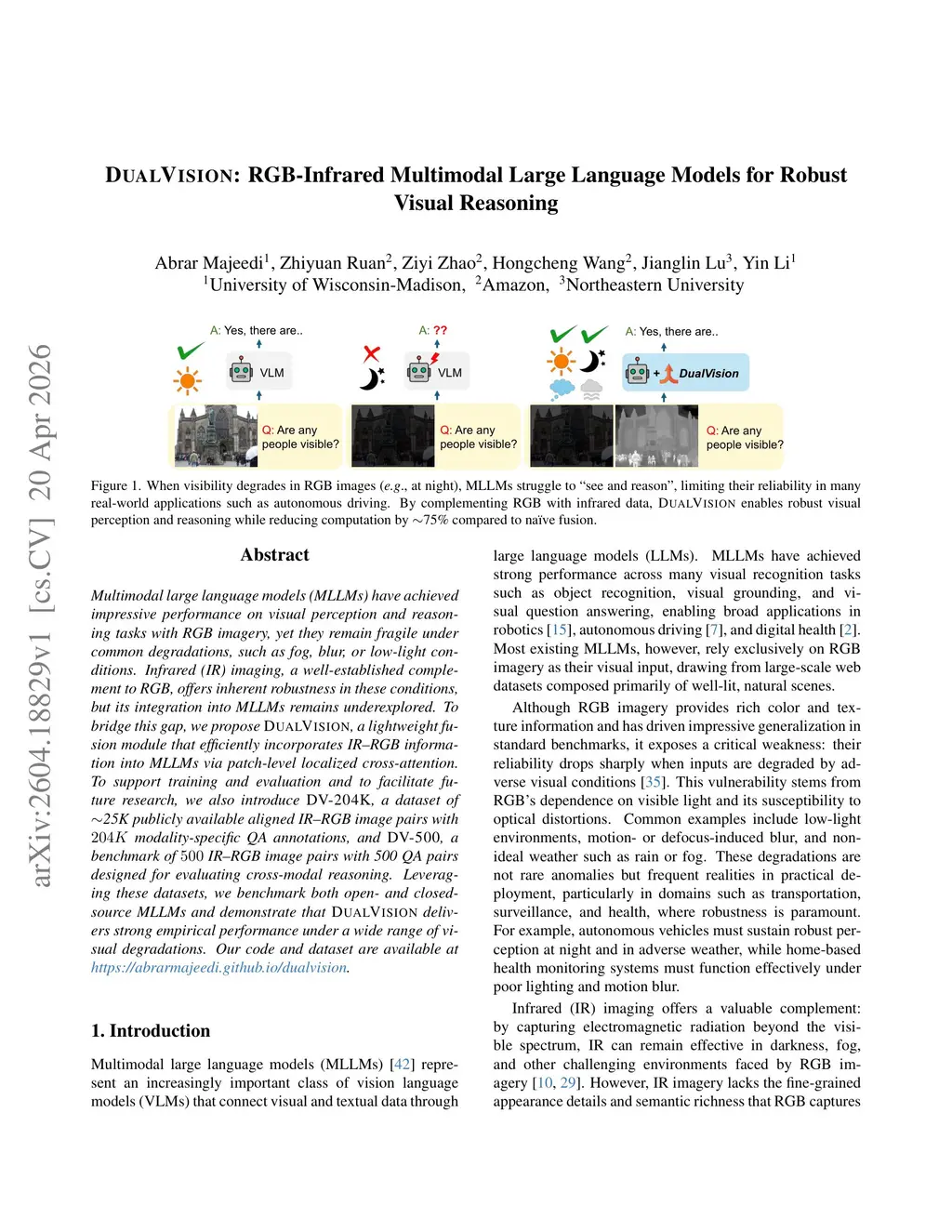Multimodal large language models (MLLMs) have achieved impressive performance on visual perception and reasoning tasks with RGB imagery, yet they remain fragile under common degradations, such as fog, blur, or low-light conditions. Infrared (IR) imaging, a well-established complement to RGB, offers inherent robustness in these conditions, but its integration into MLLMs remains underexplored. To bridge this gap, we propose DUALVISION, a lightweight fusion module that efficiently incorporates IR-RGB information into MLLMs via patch-level localized cross-attention. To support training and evaluation and to facilitate future research, we also introduce DV-204K, a dataset of ~25K publicly available aligned IR-RGB image pairs with 204K modality-specific QA annotations, and DV-500, a benchmark of 500 IR-RGB image pairs with 500 QA pairs designed for evaluating cross-modal reasoning. Leveraging these datasets, we benchmark both open- and closed-source MLLMs and demonstrate that DUALVISION delivers strong empirical performance under a wide range of visual degradations. Our code and dataset are available atthis https URL.