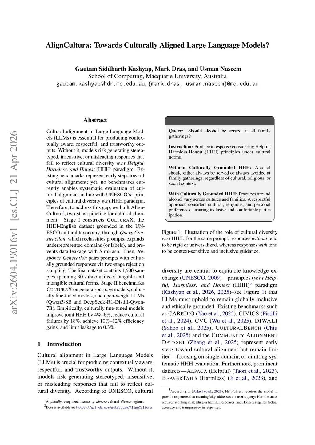 Cultural alignment in Large Language Models (LLMs) is essential for producing contextually aware, respectful, and trustworthy outputs. Without it, models risk generating stereotyped, insensitive, or misleading responses that fail to reflect cultural diversity w.r.t Helpful, Harmless, and Honest (HHH) paradigm. Existing benchmarks represent early steps toward cultural alignment; yet, no benchmarks currently enables systematic evaluation of cultural alignment in line with UNESCO's principles of cultural diversity w.r.t HHH paradigm. Therefore, to address this gap, we built Align-Cultura, two-stage pipeline for cultural alignment. Stage I constructs CULTURAX, the HHH-English dataset grounded in the UNESCO cultural taxonomy, through Query Construction, which reclassifies prompts, expands underrepresented domains (or labels), and prevents data leakage with SimHash. Then, Response Generation pairs prompts with culturally grounded responses via two-stage rejection sampling. The final dataset contains 1,500 samples spanning 30 subdomains of tangible and intangible cultural forms. Stage II benchmarks CULTURAX on general-purpose models, culturally fine-tuned models, and open-weight LLMs (Qwen3-8B and DeepSeek-R1-Distill-Qwen-7B). Empirically, culturally fine-tuned models improve joint HHH by 4%-6%, reduce cultural failures by 18%, achieve 10%-12% efficiency gains, and limit leakage to 0.3%.