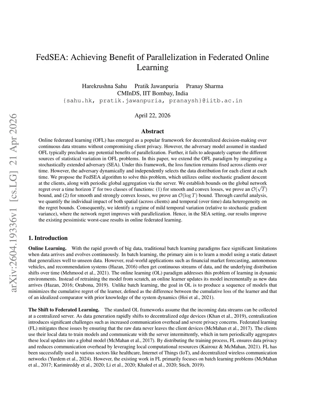 Online federated learning (OFL) has emerged as a popular framework for decentralized decision-making over continuous data streams without compromising client privacy. However, the adversary model assumed in standard OFL typically precludes any potential benefits of parallelization. Further, it fails to adequately capture the different sources of statistical variation in OFL problems. In this paper, we extend the OFL paradigm by integrating a stochastically extended adversary (SEA). Under this framework, the loss function remains fixed across clients over time. However, the adversary dynamically and independently selects the data distribution for each client at each time. We propose the \algoOFL{} algorithm to solve this problem, which utilizes online stochastic gradient descent at the clients, along with periodic global aggregation via the server. We establish bounds on the global network regret over a time horizon \(T\) for two classes of functions: (1) for smooth and convex losses, we prove an \(\mathcal{O}(\sqrt{T})\) bound, and (2) for smooth and strongly convex losses, we prove an \(\mathcal{O}(\log T)\) bound. Through careful analysis, we quantify the individual impact of both spatial (across clients) and temporal (over time) data heterogeneity on the regret bounds. Consequently, we identify a regime of mild temporal variation (relative to stochastic gradient variance), where the network regret improves with parallelization. Hence, in the SEA setting, our results improve the existing pessimistic worst-case results in online federated learning.