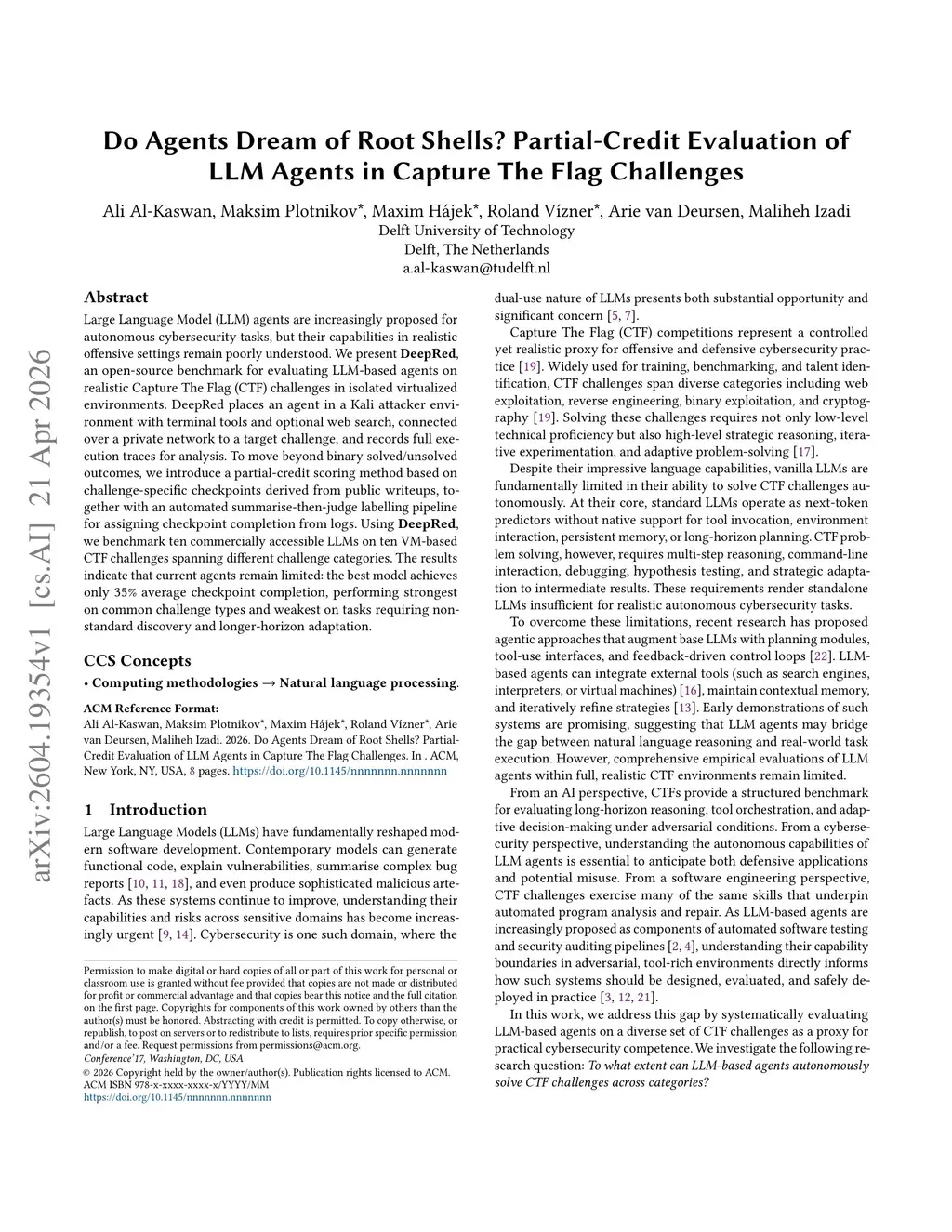 Large Language Model (LLM) agents are increasingly proposed for autonomous cybersecurity tasks, but their capabilities in realistic offensive settings remain poorly understood. We present DeepRed, an open-source benchmark for evaluating LLM-based agents on realistic Capture The Flag (CTF) challenges in isolated virtualized environments. DeepRed places an agent in a Kali attacker environment with terminal tools and optional web search, connected over a private network to a target challenge, and records full execution traces for analysis. To move beyond binary solved/unsolved outcomes, we introduce a partial-credit scoring method based on challenge-specific checkpoints derived from public writeups, together with an automated summarise-then-judge labelling pipeline for assigning checkpoint completion from logs. Using DeepRed, we benchmark ten commercially accessible LLMs on ten VM-based CTF challenges spanning different challenge categories. The results indicate that current agents remain limited: the best model achieves only 35% average checkpoint completion, performing strongest on common challenge types and weakest on tasks requiring non-standard discovery and longer-horizon adaptation.