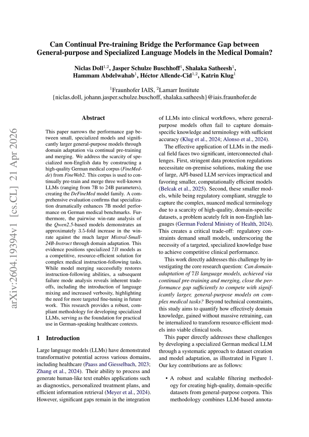 This paper narrows the performance gap between small, specialized models and significantly larger general-purpose models through domain adaptation via continual pre-training and merging. We address the scarcity of specialized non-English data by constructing a high-quality German medical corpus (FineMed-de) from FineWeb2. This corpus is used to continually pre-train and merge three well-known LLMs (ranging from to parameters), creating the DeFineMed model family. A comprehensive evaluation confirms that specialization dramatically enhances model performance on German medical benchmarks. Furthermore, the pairwise win-rate analysis of the Qwen2.5-based models demonstrates an approximately -fold increase in the win-rate against the much larger Mistral-Small-24B-Instruct through domain adaptation. This evidence positions specialized models as a competitive, resource-efficient solution for complex medical instruction-following tasks. While model merging successfully restores instruction-following abilities, a subsequent failure mode analysis reveals inherent trade-offs, including the introduction of language mixing and increased verbosity, highlighting the need for more targeted fine-tuning in future work. This research provides a robust, compliant methodology for developing specialized LLMs, serving as the foundation for practical use in German-speaking healthcare contexts.