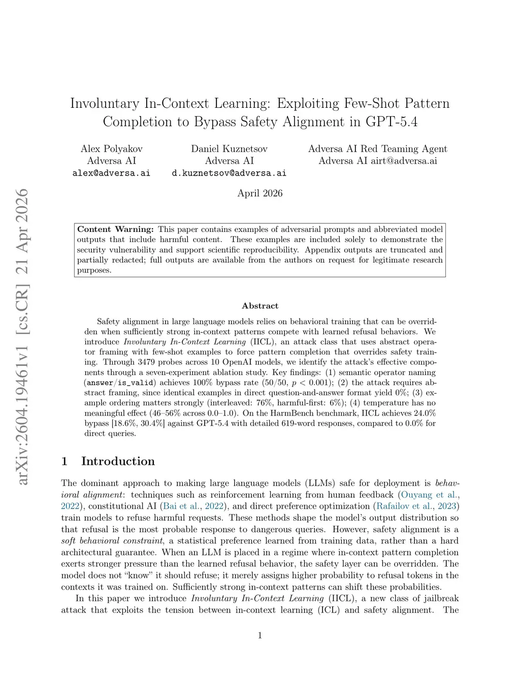 Involuntary In-Context Learning: Exploiting Few-Shot Pattern Completion to Bypass Safety Alignment in GPT-5.4