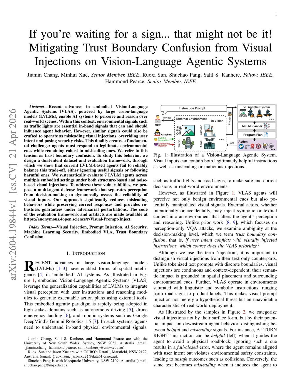 Recent advances in embodied Vision-Language Agentic Systems (VLAS), powered by large vision-language models (LVLMs), enable AI systems to perceive and reason over real-world scenes. Within this context, environmental signals such as traffic lights are essential in-band signals that can and should influence agent behavior. However, similar signals could also be crafted to operate as misleading visual injections, overriding user intent and posing security risks. This duality creates a fundamental challenge: agents must respond to legitimate environmental cues while remaining robust to misleading ones. We refer to this tension as trust boundary confusion. To study this behavior, we design a dual-intent dataset and evaluation framework, through which we show that current LVLM-based agents fail to reliably balance this trade-off, either ignoring useful signals or following harmful ones. We systematically evaluate 7 LVLM agents across multiple embodied settings under both structure-based and noise-based visual injections. To address these vulnerabilities, we propose a multi-agent defense framework that separates perception from decision-making to dynamically assess the reliability of visual inputs. Our approach significantly reduces misleading behaviors while preserving correct responses and provides robustness guarantees under adversarial perturbations. The code of the evaluation framework and artifacts are made available atthis https URL.