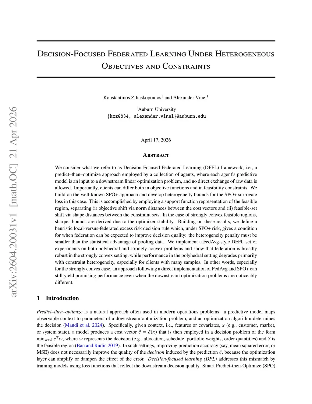We consider what we refer to as {Decision-Focused Federated Learning (DFFL)} framework, i.e., a predict-then-optimize approach employed by a collection of agents, where each agent's predictive model is an input to a downstream linear optimization problem, and no direct exchange of raw data is allowed. Importantly, clients can differ both in objective functions and in feasibility constraints. We build on the well-known SPO+ approach and develop heterogeneity bounds for the SPO+ surrogate loss in this case. This is accomplished by employing a support function representation of the feasible region, separating (i) objective shift via norm distances between the cost vectors and (ii) feasible-set shift via shape distances between the constraint sets. In the case of strongly convex feasible regions, sharper bounds are derived due to the optimizer stability. Building on these results, we define a heuristic local-versus-federated excess risk decision rule which, under SPO+ risk, gives a condition for when federation can be expected to improve decision quality: the heterogeneity penalty must be smaller than the statistical advantage of pooling data. We implement a FedAvg-style DFFL set of experiments on both polyhedral and strongly convex problems and show that federation is broadly robust in the strongly convex setting, while performance in the polyhedral setting degrades primarily with constraint heterogeneity, especially for clients with many samples. In other words, especially for the strongly convex case, an approach following a direct implementation of FedAvg and SPO+ can still yield promising performance even when the downstream optimization problems are noticeably different.