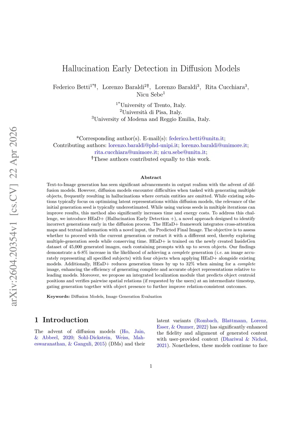 Text-to-Image generation has seen significant advancements in output realism with the advent of diffusion models. However, diffusion models encounter difficulties when tasked with generating multiple objects, frequently resulting in hallucinations where certain entities are omitted. While existing solutions typically focus on optimizing latent representations within diffusion models, the relevance of the initial generation seed is typically underestimated. While using various seeds in multiple iterations can improve results, this method also significantly increases time and energy costs. To address this challenge, we introduce HEaD+ (Hallucination Early Detection +), a novel approach designed to identify incorrect generations early in the diffusion process. The HEaD+ framework integrates cross-attention maps and textual information with a novel input, the Predicted Final Image. The objective is to assess whether to proceed with the current generation or restart it with a different seed, thereby exploring multiple-generation seeds while conserving time. HEaD+ is trained on the newly created InsideGen dataset of 45,000 generated images, each containing prompts with up to seven objects. Our findings demonstrate a 6-8% increase in the likelihood of achieving a complete generation (i.e., an image accurately representing all specified subjects) with four objects when applying HEaD+ alongside existing models. Additionally, HEaD+ reduces generation times by up to 32% when aiming for a complete image, enhancing the efficiency of generating complete and accurate object representations relative to leading models. Moreover, we propose an integrated localization module that predicts object centroid positions and verifies pairwise spatial relations (if requested by the users) at an intermediate timestep, gating generation together with object presence to further improve relation-consistent outcomes.