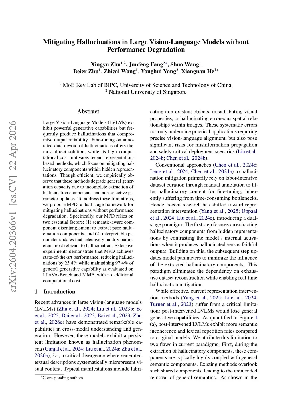 Large Vision-Language Models (LVLMs) exhibit powerful generative capabilities but frequently produce hallucinations that compromise output reliability. Fine-tuning on annotated data devoid of hallucinations offers the most direct solution, while its high computational cost motivates recent representation-based methods, which focus on mitigating hallucinatory components within hidden representations. Though efficient, we empirically observe that these methods degrade general generation capacity due to incomplete extraction of hallucination components and non-selective parameter updates. To address these limitations, we propose MPD, a dual-stage framework for mitigating hallucinations without performance degradation. Specifically, our MPD relies on two essential factors: (1) semantic-aware component disentanglement to extract pure hallucination components, and (2) interpretable parameter updates that selectively modify parameters most relevant to hallucination. Extensive experiments demonstrate that MPD achieves state-of-the-art performance, reducing hallucinations by 23.4\% while maintaining 97.4\% of general generative capability as evaluated on LLaVA-Bench and MME, with no additional computational cost.