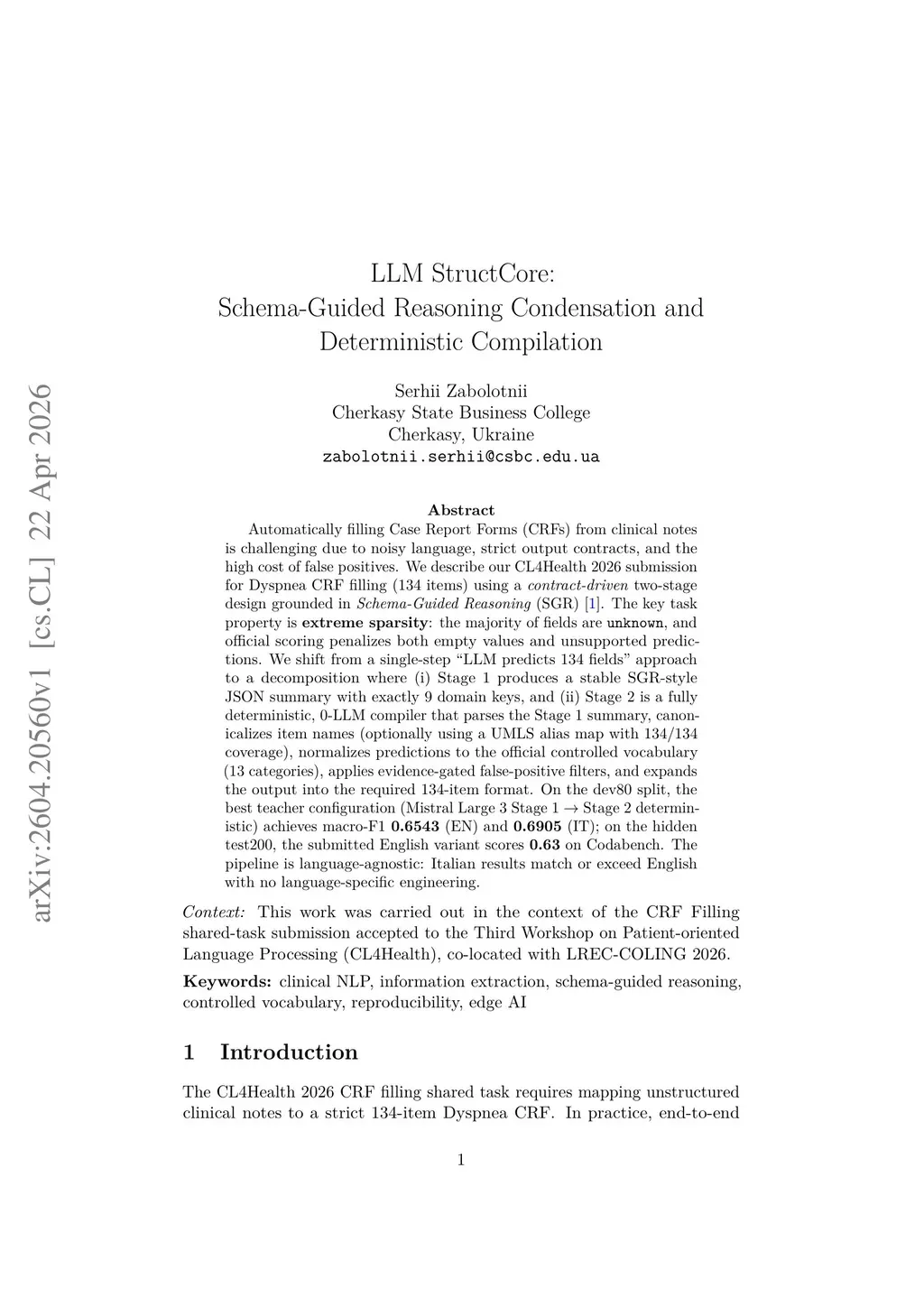 Automatically filling Case Report Forms (CRFs) from clinical notes is challenging due to noisy language, strict output contracts, and the high cost of false positives. We describe our CL4Health 2026 submission for Dyspnea CRF filling (134 items) using a contract-driven two-stage design grounded in Schema-Guided Reasoning (SGR). The key task property is extreme sparsity: the majority of fields are unknown, and official scoring penalizes both empty values and unsupported predictions. We shift from a single-step "LLM predicts 134 fields" approach to a decomposition where (i) Stage 1 produces a stable SGR-style JSON summary with exactly 9 domain keys, and (ii) Stage 2 is a fully deterministic, 0-LLM compiler that parses the Stage 1 summary, canonicalizes item names, normalizes predictions to the official controlled vocabulary, applies evidence-gated false-positive filters, and expands the output into the required 134-item format. On the dev80 split, the best teacher configuration achieves macro-F1 0.6543 (EN) and 0.6905 (IT); on the hidden test200, the submitted English variant scores 0.63 on Codabench. The pipeline is language-agnostic: Italian results match or exceed English with no language-specific engineering.