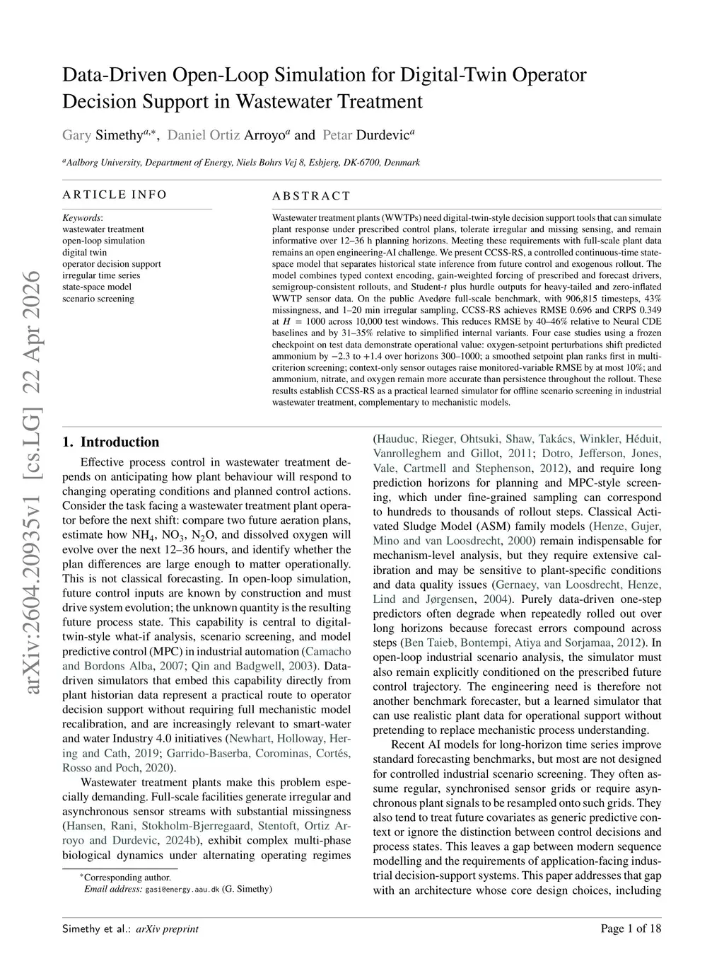 Wastewater treatment plants (WWTPs) need digital-twin-style decision support tools that can simulate plant response under prescribed control plans, tolerate irregular and missing sensing, and remain informative over 12-36 h planning horizons. Meeting these requirements with full-scale plant data remains an open engineering-AI challenge. We present CCSS-RS, a controlled continuous-time state-space model that separates historical state inference from future control and exogenous rollout. The model combines typed context encoding, gain-weighted forcing of prescribed and forecast drivers, semigroup-consistent rollouts, and Student-t plus hurdle outputs for heavy-tailed and zero-inflated WWTP sensor data. On the public Avedøre full-scale benchmark, with 906,815 timesteps, 43% missingness, and 1-20 min irregular sampling, CCSS-RS achieves RMSE 0.696 and CRPS 0.349 at H=1000 across 10,000 test windows. This reduces RMSE by 40-46% relative to Neural CDE baselines and by 31-35% relative to simplified internal variants. Four case studies using a frozen checkpoint on test data demonstrate operational value: oxygen-setpoint perturbations shift predicted ammonium by -2.3 to +1.4 over horizons 300-1000; a smoothed setpoint plan ranks first in multi-criterion screening; context-only sensor outages raise monitored-variable RMSE by at most 10%; and ammonium, nitrate, and oxygen remain more accurate than persistence throughout the rollout. These results establish CCSS-RS as a practical learned simulator for offline scenario screening in industrial wastewater treatment, complementary to mechanistic models.