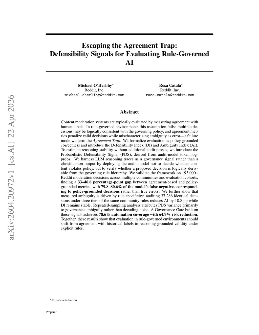 Content moderation systems are typically evaluated by measuring agreement with human labels. In rule-governed environments this assumption fails: multiple decisions may be logically consistent with the governing policy, and agreement metrics penalize valid decisions while mischaracterizing ambiguity as error - a failure mode we term the Agreement Trap. We formalize evaluation as policy-grounded correctness and introduce the Defensibility Index (DI) and Ambiguity Index (AI). To estimate reasoning stability without additional audit passes, we introduce the Probabilistic Defensibility Signal (PDS), derived from audit-model token logprobs. We harness LLM reasoning traces as a governance signal rather than a classification output by deploying the audit model not to decide whether content violates policy, but to verify whether a proposed decision is logically derivable from the governing rule hierarchy. We validate the framework on 193,000+ Reddit moderation decisions across multiple communities and evaluation cohorts, finding a 33-46.6 percentage-point gap between agreement-based and policy-grounded metrics, with 79.8-80.6% of the model's false negatives corresponding to policy-grounded decisions rather than true errors. We further show that measured ambiguity is driven by rule specificity: auditing 37,286 identical decisions under three tiers of the same community rules reduces AI by 10.8 pp while DI remains stable. Repeated-sampling analysis attributes PDS variance primarily to governance ambiguity rather than decoding noise. A Governance Gate built on these signals achieves 78.6% automation coverage with 64.9% risk reduction. Together, these results show that evaluation in rule-governed environments should shift from agreement with historical labels to reasoning-grounded validity under explicit rules.