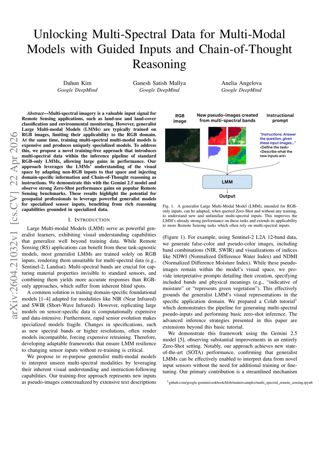 Multi-spectral imagery is a valuable input signal for Remote Sensing applications, such as land-use and land-cover classification and environmental monitoring. However, generalist Large Multi-modal Models (LMMs) are typically trained on RGB images, limiting their applicability to the RGB domain. At the same time, training multi-spectral multi-modal models is expensive and produces uniquely specialized models. To address this, we propose a novel training-free approach that introduces multi-spectral data within the inference pipeline of standard RGB-only LMMs, allowing large gains in performance. Our approach leverages the LMMs' understanding of the visual space by adapting non-RGB inputs to that space and injecting domain-specific information and Chain-of-Thought reasoning as instructions. We demonstrate this with the Gemini 2.5 model and observe strong Zero-Shot performance gains on popular Remote Sensing benchmarks. These results highlight the potential for geospatial professionals to leverage powerful generalist models for specialized sensor inputs, benefiting from rich reasoning capabilities grounded in specialized data.