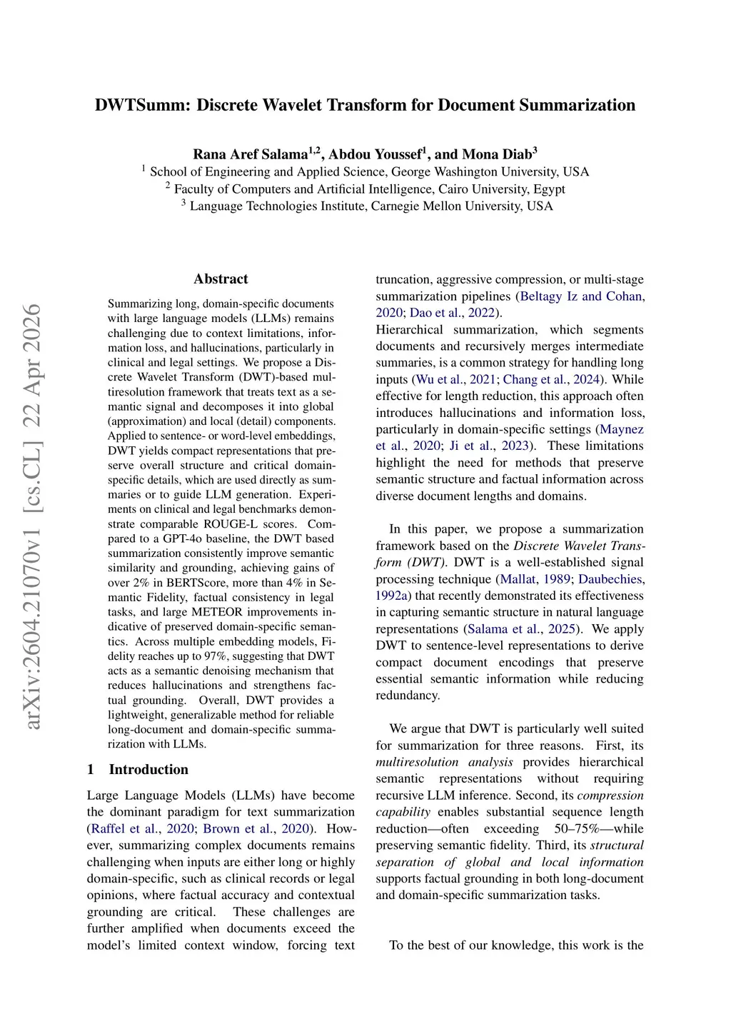 Summarizing long, domain-specific documents with large language models (LLMs) remains challenging due to context limitations, information loss, and hallucinations, particularly in clinical and legal settings. We propose a Discrete Wavelet Transform (DWT)-based multi-resolution framework that treats text as a semantic signal and decomposes it into global (approximation) and local (detail) components. Applied to sentence- or word-level embeddings, DWT yields compact representations that preserve overall structure and critical domain-specific details, which are used directly as summaries or to guide LLM generation. Experiments on clinical and legal benchmarks demonstrate comparable ROUGE-L scores. Compared to a GPT-4o baseline, the DWT based summarization consistently improve semantic similarity and grounding, achieving gains of over 2% in BERTScore, more than 4\% in Semantic Fidelity, factual consistency in legal tasks, and large METEOR improvements indicative of preserved domain-specific semantics. Across multiple embedding models, Fidelity reaches up to 97%, suggesting that DWT acts as a semantic denoising mechanism that reduces hallucinations and strengthens factual grounding. Overall, DWT provides a lightweight, generalizable method for reliable long-document and domain-specific summarization with LLMs.