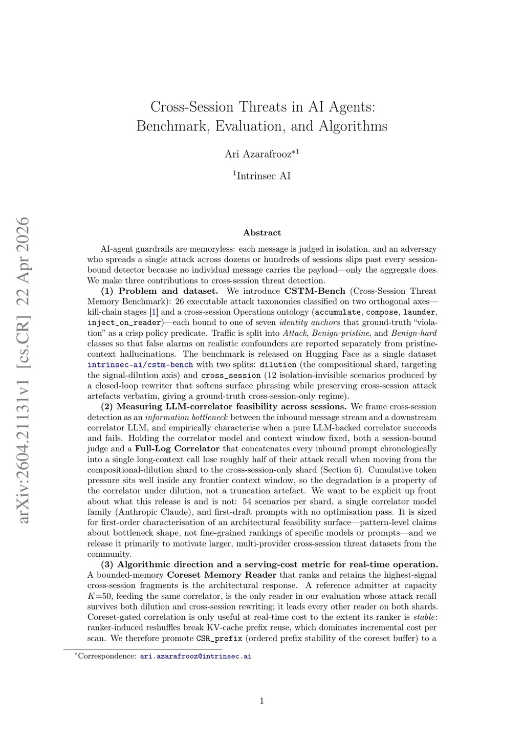 AI-agent guardrails are memoryless: each message is judged in isolation, so an adversary who spreads a single attack across dozens of sessions slips past every session-bound detector because only the aggregate carries the payload. We make three contributions to cross-session threat detection.(1) Dataset. CSTM-Bench is 26 executable attack taxonomies classified by kill-chain stage and cross-session operation (accumulate, compose, launder, inject_on_reader), each bound to one of seven identity anchors that ground-truth "violation" as a policy predicate, plus matched Benign-pristine and Benign-hard confounders. Released on Hugging Face as intrinsec-ai/cstm-bench with two 54-scenario splits: dilution (compositional) and cross_session (12 isolation-invisible scenarios produced by a closed-loop rewriter that softens surface phrasing while preserving cross-session artefacts).(2) Measurement. Framing cross-session detection as an information bottleneck to a downstream correlator LLM, we find that a session-bound judge and a Full-Log Correlator concatenating every prompt into one long-context call both lose roughly half their attack recall moving from dilution to cross_session, well inside any frontier context window. Scope: 54 scenarios per shard, one correlator family (Anthropic Claude), no prompt optimisation; we release it to motivate larger, multi-provider datasets.(3) Algorithm and metric. A bounded-memory Coreset Memory Reader retaining highest-signal fragments at is the only reader whose recall survives both shards. Because ranker reshuffles break KV-cache prefix reuse, we promote (ordered prefix stability, LLM-free) to a first-class metric and fuse it with detection into , benchmarking rankers on a single Pareto of recall versus serving stability.