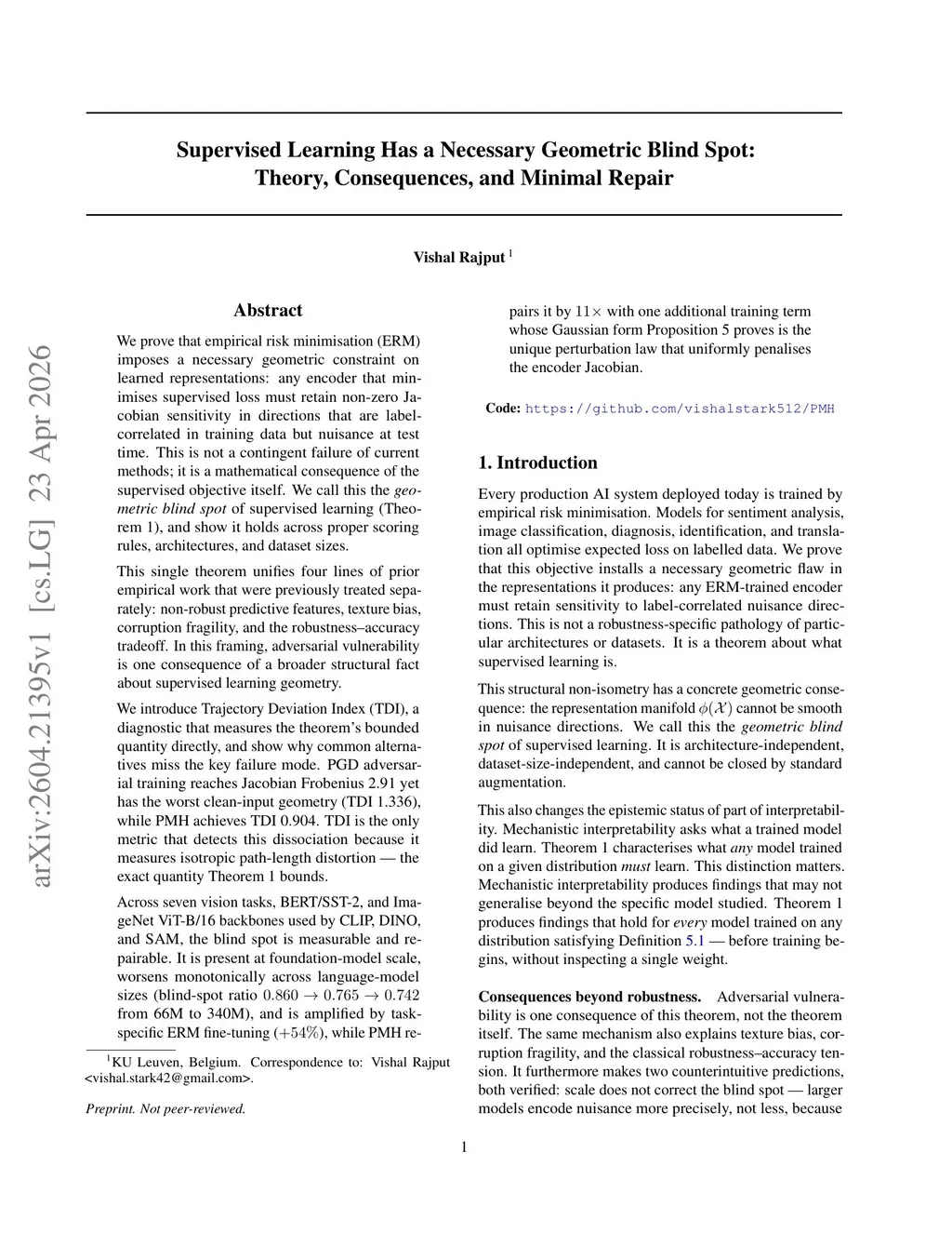 We prove that empirical risk minimisation (ERM) imposes a necessary geometric constraint on learned representations: any encoder that minimises supervised loss must retain non-zero Jacobian sensitivity in directions that are label-correlated in training data but nuisance at test time. This is not a contingent failure of current methods; it is a mathematical consequence of the supervised objective itself. We call this the geometric blind spot of supervised learning (Theorem 1), and show it holds across proper scoring rules, architectures, and dataset sizes.This single theorem unifies four lines of prior empirical work that were previously treated separately: non-robust predictive features, texture bias, corruption fragility, and the robustness-accuracy tradeoff. In this framing, adversarial vulnerability is one consequence of a broader structural fact about supervised learning geometry.We introduce Trajectory Deviation Index (TDI), a diagnostic that measures the theorem's bounded quantity directly, and show why common alternatives miss the key failure mode. PGD adversarial training reaches Jacobian Frobenius 2.91 yet has the worst clean-input geometry (TDI 1.336), while PMH achieves TDI 0.904. TDI is the only metric that detects this dissociation because it measures isotropic path-length distortion -- the exact quantity Theorem 1 bounds.Across seven vision tasks, BERT/SST-2, and ImageNet ViT-B/16 backbones used by CLIP, DINO, and SAM, the blind spot is measurable and repairable. It is present at foundation-model scale, worsens monotonically across language-model sizes (blind-spot ratio 0.860 to 0.765 to 0.742 from 66M to 340M), and is amplified by task-specific ERM fine-tuning (+54%), while PMH repairs it by 11x with one additional training term whose Gaussian form Proposition 5 proves is the unique perturbation law that uniformly penalises the encoder Jacobian.