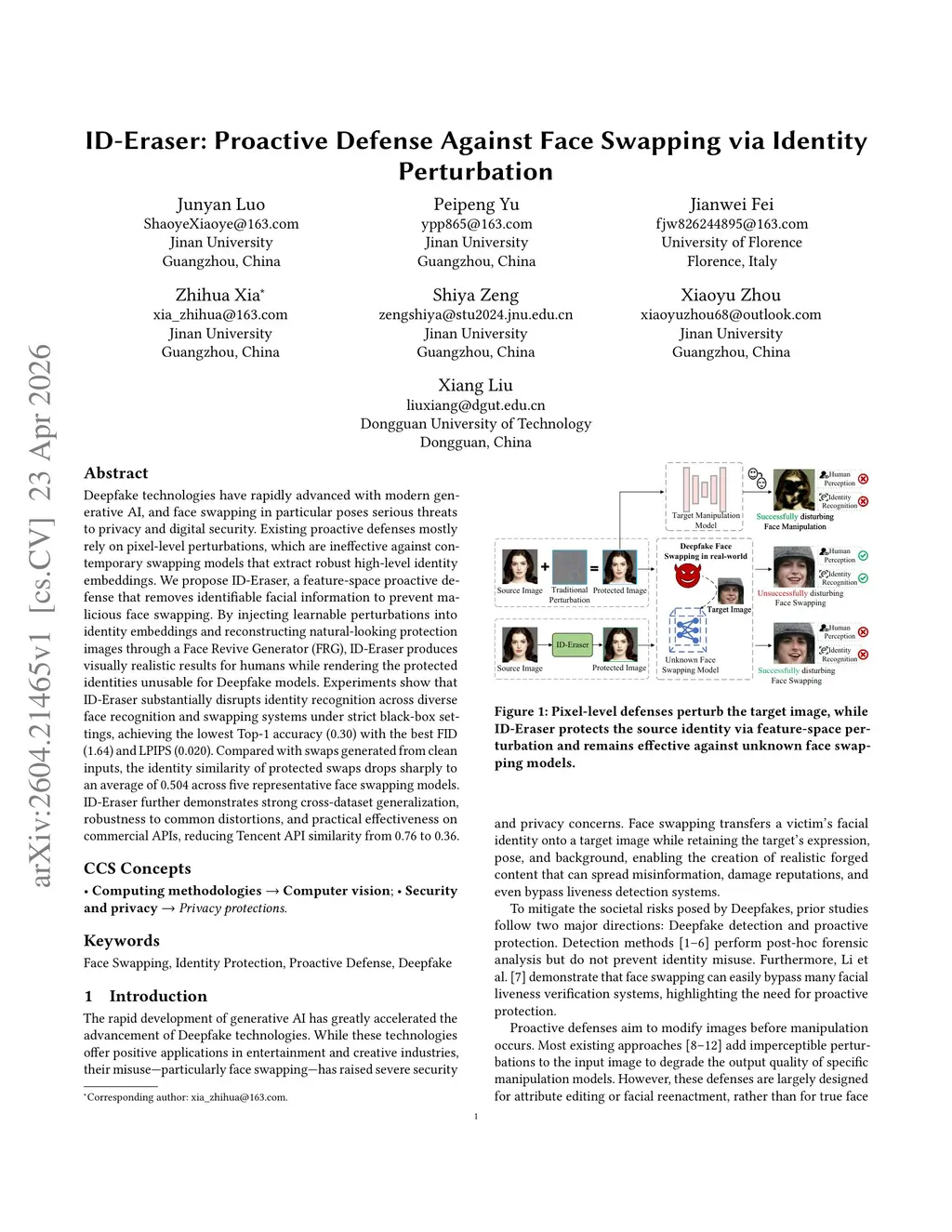 Deepfake technologies have rapidly advanced with modern generative AI, and face swapping in particular poses serious threats to privacy and digital security. Existing proactive defenses mostly rely on pixel-level perturbations, which are ineffective against contemporary swapping models that extract robust high-level identity embeddings. We propose ID-Eraser, a feature-space proactive defense that removes identifiable facial information to prevent malicious face swapping. By injecting learnable perturbations into identity embeddings and reconstructing natural-looking protection images through a Face Revive Generator (FRG), ID-Eraser produces visually realistic results for humans while rendering the protected identities unusable for Deepfake models. Experiments show that ID-Eraser substantially disrupts identity recognition across diverse face recognition and swapping systems under strict black-box settings, achieving the lowest Top-1 accuracy (0.30) with the best FID (1.64) and LPIPS (0.020). Compared with swaps generated from clean inputs, the identity similarity of protected swaps drops sharply to an average of 0.504 across five representative face swapping models. ID-Eraser further demonstrates strong cross-dataset generalization, robustness to common distortions, and practical effectiveness on commercial APIs, reducing Tencent API similarity from 0.76 to 0.36.
