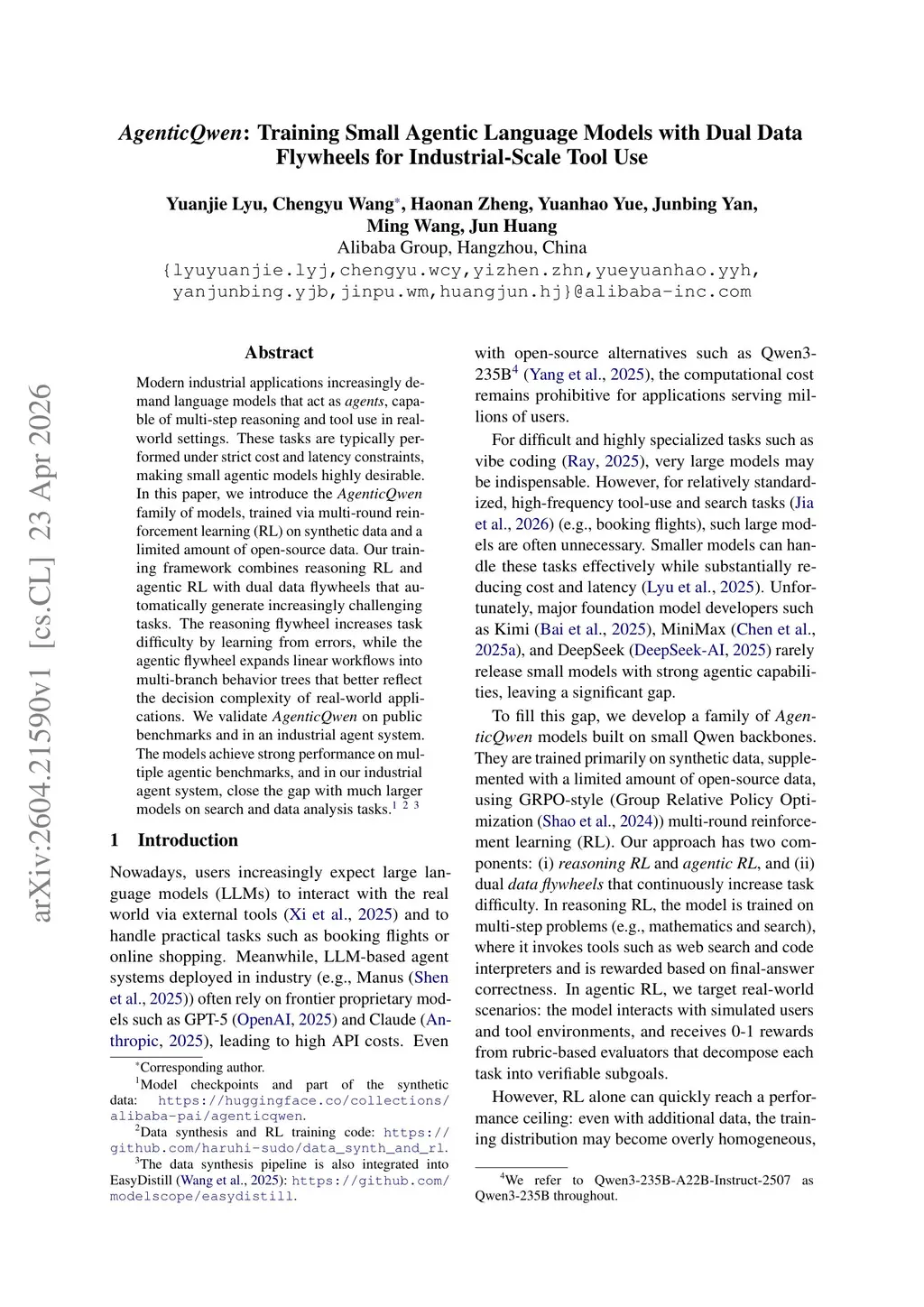 Modern industrial applications increasingly demand language models that act as agents, capable of multi-step reasoning and tool use in real-world settings. These tasks are typically performed under strict cost and latency constraints, making small agentic models highly desirable. In this paper, we introduce the AgenticQwen family of models, trained via multi-round reinforcement learning (RL) on synthetic data and a limited amount of open-source data. Our training framework combines reasoning RL and agentic RL with dual data flywheels that automatically generate increasingly challenging tasks. The reasoning flywheel increases task difficulty by learning from errors, while the agentic flywheel expands linear workflows into multi-branch behavior trees that better reflect the decision complexity of real-world applications. We validate AgenticQwen on public benchmarks and in an industrial agent system. The models achieve strong performance on multiple agentic benchmarks, and in our industrial agent system, close the gap with much larger models on search and data analysis tasks. Model checkpoints and part of the synthetic data:this https URL. Data synthesis and RL training code:this https URL. The data synthesis pipeline is also integrated into EasyDistill:this https URL.