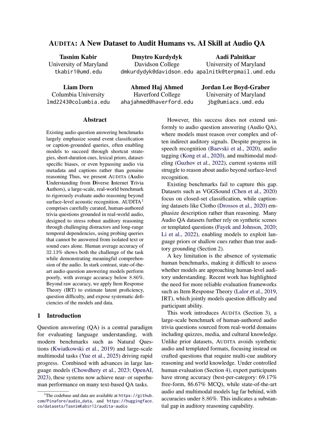 AUDITA: A New Dataset to Audit Humans vs. AI Skill at Audio QA